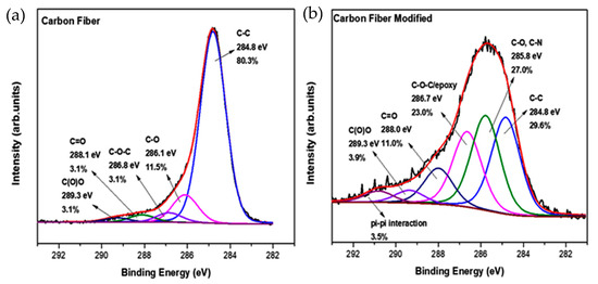 In order to identify further the functional chemical groups of the epoxy-CFs, X-ray photoelectron spectroscopy (XPS) measurements were employed. From the C1s high resolution photoelectron spectra (Figure 7), several changes after the chemical modification were deduced. The most important information that was collected here was the reduction in the C-C frame from 80.3% for the pristine CFs to 29.6% for the epoxy-CFs. The peak at 286.1 eV is increased because of the addition of C-O and also C-N bonds. The existence of these two functionalities explains the small shift from 286.1 eV, due to CFs, to 285.8 eV. Important evidence for the successful functionalization of CFs is the significant increase in the photoelectron peak at 286.8 eV from 3.1% to 23.0%. This increase is due to the epoxy group created after the chemical functionalization [29,31].