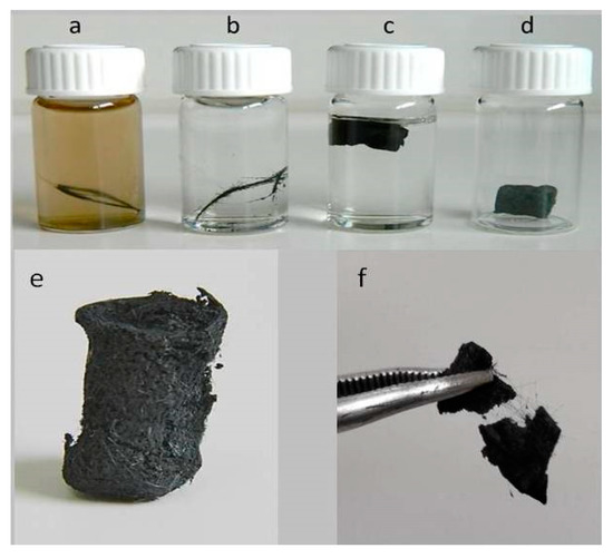Photo of (a) epoxy-CFs in an alkaline solution of GO, (b) epoxy-CFs covered by the rGO nanosheets after hydrothermal heating, (c) CFs/rGO hydrogel and (d,e) aerogel, (f) CFs/rGO aerogel separated in two pieces using forcepts, where CFs are revealed from the internal.