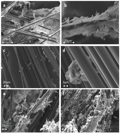CFs have a mean size of 0.3–0.5 cm and were randomly oriented in the GA, as observed optically under a microscope. This is a consequence of the random dispersion of CFs into the mixture of the GO before the hydrothermal treatment. CFs/rGO aerogel can be also formed in a single stage hydrothermal procedure by directly dispersing epoxy-CFs in a concentrated dispersion of GO in alkaline solution of TETA. In Figure 9, several characteristic images of rGO-covered epoxy-CFs are presented (Figure 9a,b,e,f), in comparison with poorly rGO-covered pristine CFs (Figure 9c,d) that were formed when pristine CFs were used instead of epoxy-CFs. As shown in Figure 9a–d, rGO nanosheets have extensively covered the surface of the epoxy-CFs, while the absence of epoxy groups in pristine CFs leads to much less coverage by rGO, as shown in Figure 9c,d. Finally, Figure 9e,f indicate the successful incorporation of CFs in the CFs/rGO aerogel. Due to the interaction between the epoxy-CFs and GO in the presence of the TETA bridge molecules, the epoxy-CFs reinforced GA were more condensed, having a lower volume (0.6 cm3) than the pure rGO aerogel (0.9 cm3). In addition, taking into consideration the masses of the components and the final products, epoxy-CFs reinforced GA showed a higher density (31.6 mg/cm3) in comparison to pure rGO aerogel (12,5 mg/cm3), due to the lower volume and the presence of CFs. The mass fraction of CFs in the CFs/rGO aerogel was estimated to be 0.31 and the volume fraction to be 5 × 10−3.