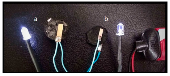 Electrical circuits with (a) CFs/rGO and (b) rGO aerogel monoliths. The intense light of the LED lamp in circuit (a) indicates the increased conductivity of CFs/rGO aerogel.