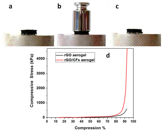 (Upper) CFs/rGO cylindrical aerogel monolith before (a) during (b) and after (c) the compression, with a 50 g standard weight. (d) The stress/compression diagram of rGO and CFs/rGO aerogel monoliths.