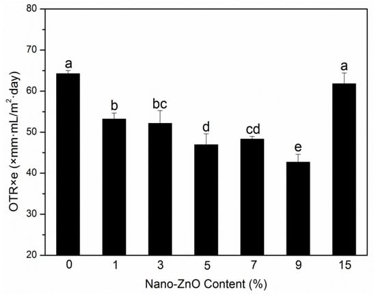The gas barrier properties of nanocomposite films are affected by many factors, such as the tortuous path of polymer crystal structure, the nanoparticle content, length/thickness ratio, size, type, and dispersion degree, the crystallinity of polymer matrix, and the immobilization of polymer chain [23,24,25]. The OTR values of the films are displayed in Figure 1. With an increase in nanoparticle content, the OTR values decreased. The binary system PLA-0 showed the highest value, whereas the largest reduction (33.5%) in OTR values was found in the ternary system PLA-9. The decrease in the OTR values confirmed the increase in oxygen barrier capabilities with the PLA nanocomposite films. The improved barrier properties can be related to the uniform distribution of nano-ZnO-made PLA matrix and nanoparticles that formed a strong interfacial adsorption, thereby resulting in chain immobilization and decreased diffusion of nanocomposite films [26]. The increase can also be associated with the crystallinity degree of the films. However, when increasing the nano-ZnO content to 15 wt%, the OTR value did not decrease. This result may be due to the cluster of nanoparticles in the PLA matrix, which resulted in the initialization of agglomeration and the formation of the permeability path and made the gas transfer fast.