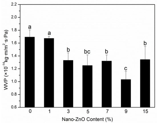 Water vapor permeability (WVP) results of PLA/ZnO nanocomposite films at different contents of ZnO nanoparticles. Values with different letters in the same column were significantly differences (p < 0.05) among the samples.