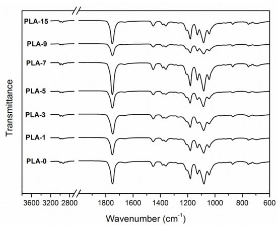 FTIR spectra of PLA/ZnO nanocomposite films at different contents of ZnO nanoparticles.
