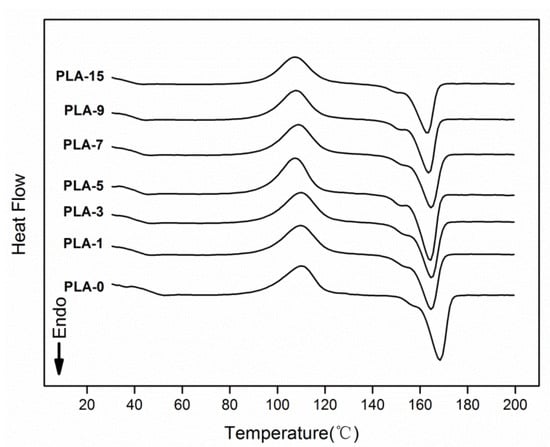 DSC experiments were characterized by using DSC 214 instruments using pure nitrogen as purging gas. The samples were first heated from 20 °C to 200 °C with a heating rate of 10 °C /min, and isothermal process was conducted at this temperature for 5 min to eliminate the anterior thermal history of the samples. A subsequent cooling down to 20 °C was performed. The second heating scan from 20 to 200 °C at 10 °C/min was then used to calculate the glass-transition temperature (Tg), cold crystallization temperature (Tc), melting temperature (Tm), and crystallinity degree (Xc) for the samples. The crystallinity degree was computed according to the following equation [40]: