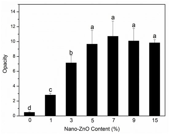 Opacity analyses of PLA/ZnO nanocomposite films at different contents of ZnO nanoparticles. Values with different letters in the same column were significantly differences (p < 0.05) among the samples.