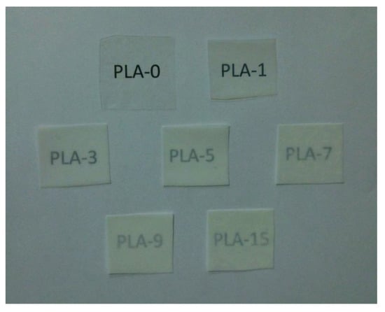 Visual appearances of PLA/ZnO nanocomposite films at different contents of ZnO nanoparticles.