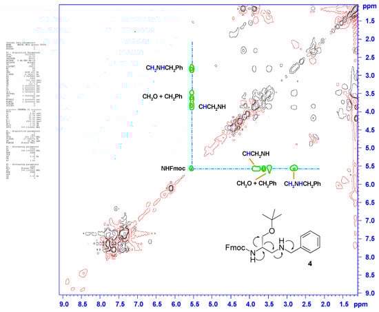 The molecular structure of 4 was confirmed by one- and two-dimensional (1D and 2D) NMR spectroscopy. In particular, the 1D 1H- and 13C-NMR spectral plots displayed the correct number, multiplicity, and integral values of all resonances assignable to the expected structure of 4. The contour plot of the 2D homonuclear proton TOCSY spectrum of the benzyl derivative 4 did not show signal overlap, facilitating the recognition of a set of cross-peaks at 5.52 ppm, in the regions between 3.90 and 3.40 ppm, and between 2.60 and 2.90 ppm, which were generated by the resonances of all correlated protons along the molecular backbone of 4 (Figure 1). Two-dimensional spectroscopy unequivocally proved the successful installation of the second amino function in substitution of the hydroxyl group of the starting d-serine backbone. These results highlighted that the reductive amination process can be a useful strategy for the realization of orthogonally protected 2,3-diaminopropanols.