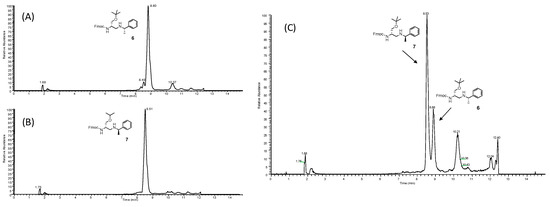 Reverse-phase (RP) U-HPLC/MS analysis of crude 6 (A), crude 7 (B), and a 2:1 mixture of diastereomers 6 and 7 (C).