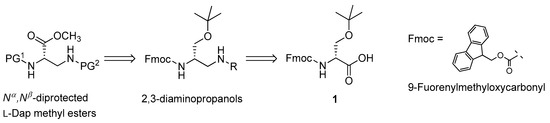 Scheme 1 shows the retrosynthetic analysis for obtaining Nα,Nβ-diprotected l-Dap methyl esters. Enantiomerically pure Fmoc-O-tert-butyl-d-serine (1), commercially available at low cost, was selected as the ideal precursor of the targeted compounds.