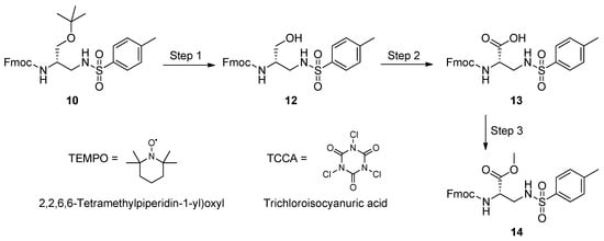Oxidation of 10 with; 1,3,5-trichloro-2,4,6-triazinetrione (trichloroisocyanuric acid, TCCA)/ (2,2,6,6-tetramethylpiperidi-1-yl)oxyl (TEMPO): preparation of Fmoc-l-Dap(Ts)-OCH3 (14) Experimental conditions: Step 1 (acydolysis), Trifluoroacetic acid (TFA)/Trifluoroethanol (TFE)/DCM, 15 min, r.t. (quantitative yield); Step 2 (oxidation), TCCA/TEMPO/NaBr/aq. NaHCO3/Acetone, 20 min. at 0 °C, then overnight, r.t.; Step 3 (methylation), 0.66 N CH2N2 in DCM, 15 min, r.t. (14, yields: 92% over 2 steps, and 68% referred to the initial amount of 1).