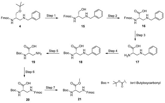 Continually, we investigated the applicability of the TEMPO-mediated oxidation to the preparation of a l-Dap methyl ester, bearing the acid-sensitive Boc and the base-labile Fmoc group on the 2- and 3-NH2 functions, respectively. We were attracted by the idea of masking the side-chain amino function of l-Dap with the Fmoc group, because this protection can easily be removed under mild conditions during amino acid coupling sequences in solution phase and/or on solid supports, generally used in the total synthesis of oligopeptide strands and biologically active peptides. To fulfill our aim, we turned our attention on the benzyl-protected 2,3-diaminopropan-1-ol 4. The presence of the benzyl group is beneficial, because it can effortlessly be removed by catalytic hydrogen transfer, preserving sensitive functional groups, base- and acid-labile masking moieties, and the chiral integrity of neighboring chiral carbon atoms. We planned a multi-step procedure, which could sequentially employ only crude products, as they are obtained via the simple work-up of the respective reactions, minimizing the number of time-expending and tedious chromatographic purifications. Scheme 5 displays the synthetic approach used to convert 4 into the targeted fully protected l-Dap methyl ester 21.