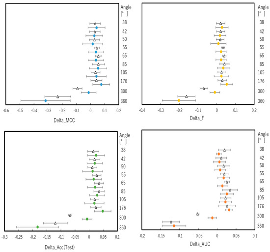 where TP, FN, TN, and FP denote true positive, false negative, true negative, and false positive, respectively. As determination of optimal cutoff point for definition of TP, FN, TN, and FP, the method of maximizing of sensitivity − (1 − specificity) that is called the Youden index [73,74]—that has a range from 0 to 1, with the values closer to 1 representing that effectiveness is larger, while the values closer to 0 are limited effectiveness—is adopted using JMP Pro software. The differences in the mean values of AUC, BAC, F, MCC, Loss (Val), Acc (Test), and Acc (Val) between one angle and the other nine angles are indicated as Delta_AUC, Delta_BAC, Delta_F, Delta_MCC, Delta_ Loss (Val), Delta_ Acc (Test), and Delta_ Acc (Val), respectively, with 95% CI as calculated by Microsoft Excel 2016.