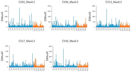 Distance to the model (DmodX) plot. Score scatterplot of the PCA model of data X. Tra and Test datasets were shown by blue and orange bars, respectively. Five datasets on top ≥ 30% of threshold were exhibited as CV01_Max0.3, CV04_Max0.3, CV13_Max0.3, CV17_Max0.3, and CV24_Max0.3.