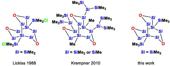- Fischer, R.; Konopa, T.; Ully, S.; Baumgartner, J.; Marschner, C. Route Si6 revisited. J. Organomet. Chem. 2003, 685, 79–92. [Google Scholar] [CrossRef]