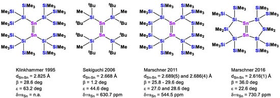 Known tetrasilylated distannenes with key structural values of Sn-Sn bond distance, bending angle β, twisting angle ε, and 119Sn NMR chemical shift value.