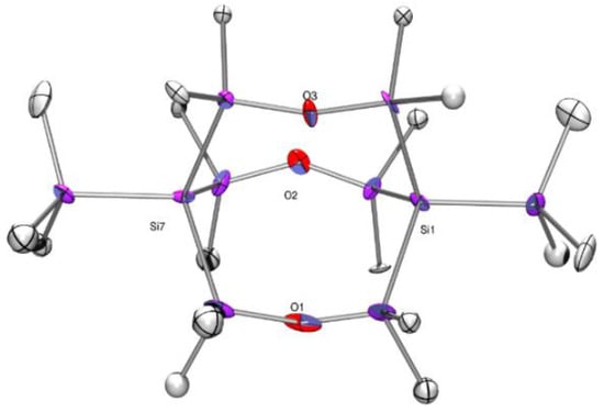 It took us some time to find the correct space group (tetragonal, P41) for compound 3 due to its merohedral twinning. The molecular structure features a regular symmetric 3,7,10-trioxa-octasilabicyclo[3.3.3]undecane with trimethylsilyl groups attached to the bridgehead silicon atoms (Figure 1). The Me3Si-Si and Si-SiMe2O bond distances of 2.35 and 2.34 Å indicate a non strained cage geometry. All Si-O distances are close to 1.64 Å, and the Si-O-Si angles range between 147.9 and 151.7 deg, which is quite typical for this class of compounds. A distance of 4.695 Å was detected between the two bridgehead atoms of compound 3. This corresponds nicely to a distance of 4.706 Å found for the Lickiss compound. For Krempner’s compound, this distance amounts only to 4.473 Å [17]. The reason for this is likely that the bulky 2-trisilanyl groups in the 2-, 8-, and 9-positions cause a twisting of the 3,7,10-trioxa-octasilabicyclo[3.3.3]undecane cage, which shortens its lengths. For compound 3, 29Si NMR resonances at 10.9, −15.3, and −136.2 ppm for the SiMe3, SiMe2, and bridgehead Si atoms were found [15], which correlate quite nicely with the 5.5 and −136.4 ppm reported for the analogous groups in Lickiss’ compound [16].