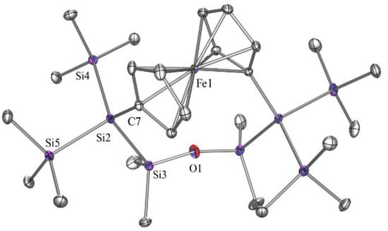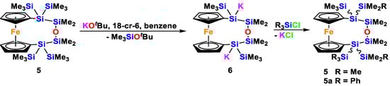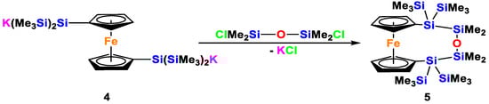 In the course of our previous studies of oligosilanyl dianions, we investigated numerous molecular bridges to connect two tris(trimethylsilyl)silyl groups [19,20,21,22,23,24,25]. In one example, we used a 1,1′-ferrocenylene unit as a spacer. Starting out from tris(trimethylsilyl)silylcyclopentadiene, it is fairly easy to prepare 1,1′-bis[tris(trimethylsilyl)silyl]ferrocene [19]. Reaction of the latter with two equivalents of potassium tert-butoxide gives the dianion 4, which could be used to prepare a number of ansa-oligosilanylene bridged ferrocenes [19]. In a similar way, we could react compound 4 with bis(chlorodimethylsilyl)siloxane to obtain compound 5 (Scheme 3).
