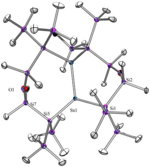 The single crystal XRD analysis of compound 7 (Figure 3) exhibits Sn-Si distances of 2.6465(8) and 2.6662(8) Å, a Sn-P distance of 2.6059(9) Å, and a Si-Sn-Si angle of 103.35(2) deg. While the distances in the stannacyclopentasilane analog are very similar, the Si-Sn-Si angle of that compound is smaller (98.17(9) deg). For the acyclic compounds [(Me3Si)3Si]2Sn·PR3 (R = Et. Me) [28,33], the Sn-Si distances range between 2.686(3) and 2.717(1) Å and the Si-Sn-Si angles increase to 114.21(4) (PEt3) and 117.53(6) (PMe3) deg.