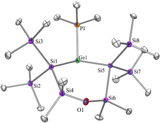 1H, 13C, and 29Si NMR spectra of compound 9 again show two signal sets for the methyl and trimethylsilyl groups on the different sides of the ring, thus indicating configurational stability of the germylene unit. However, the trimethylsilyl groups show clear signs of signal broadening, suggesting that at rt conditions, coalescence has already started. For the related germacyclopentasilane analog with PEt3 serving as base [37], the signals at rt are much broader, indicating a higher degree of inversion. However, it is not clear whether the increased configurational stability of compound 9 is based on the different ligand and different Si-Ge-Si angle or the stronger interaction between the germylene and PMe3 compared to PEt3. The Si-Ge-Si angle of compound 9 in the solid state (Figure 5) of 107.88(4) deg is larger than the respective angle of compound 7 (103.35(2) deg), which can be explained by the shorter Si-Ge bonds. The same angle in the five-membered ring examples [37,38] is also smaller (101.3(3) and 102.70(1) deg). It is known that the geometry of the tetrylene has a decisive influence on the singlet–triplet gap [39], so it can be assumed that the respective free germylene of compound 9 exhibits a higher reactivity than the examples with smaller Si-Ge-Si angles.