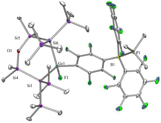 NMR spectra of compound 10 feature a combination of the cyclooligosilyloxygermanium part similar to in compound 9 with signals similar to that of Me3P·B(C6F5)3 [45] and B(p-C6F4H)3 [46]. The 1H, 13C, and 29Si spectra mainly represent the cyclooligosilyloxygermanium fragment. With two types of methyl and trimethylsilyl resonances indicating ring-side differentiation. The borate adduct part of compound 10 is mainly represented in the 19F and 31P NMR spectra. The resonance for the Ge-F unit in the 19F NMR spectrum was detected at −209.2 ppm. While no similar germanium fluoride is known, the chemical shift of the related silane [(Me3Si)2MeSi]2PhSiF at −193.5 ppm [47] supports the assignment.