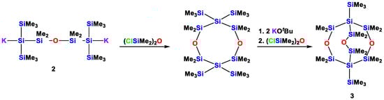 - Fischer, R.; Frank, D.; Gaderbauer, W.; Kayser, C.; Mechtler, C.; Baumgartner, J.; Marschner, C. α,ω-Oligosilyl Dianions and Their Application in the Synthesis of Homo- and Heterocyclosilanes. Organometallics 2003, 22, 3723–3731. [Google Scholar] [CrossRef]