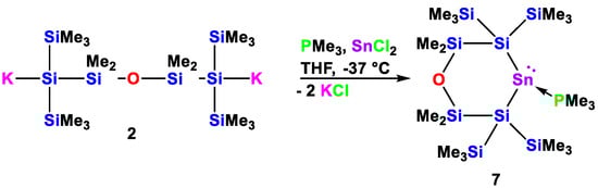 For the last part of this study, we decided to react disilanide 2 with GeCl2·dioxane and SnCl2 in the presence of PMe3 to test the formation of germylene and stannylene phosphane adducts (Scheme 5 and Scheme 6). Related reactions of two equivalents of potassium tris(trimethylsilyl)silanide with either ECl2·NHC (E = Ge, Sn; NHC = 1,3-diisopropyl-4,5-dimethyl-imidazol-2-ylidene (MeIiPr)) [26] or ECl2·PR3 (E = Ge, Sn; PR3 = PMe3, PEt3) [27,28,29] and of 1,3- and 1,4-oligosilanyldiides with ECl2·PR3 (E = Ge, Sn; PR3 = PMe3, PEt3) [30,31,32,33] gave Lewis base adducts of either acyclic or four- and five-membered cyclic disilylated germylenes and stannylenes.