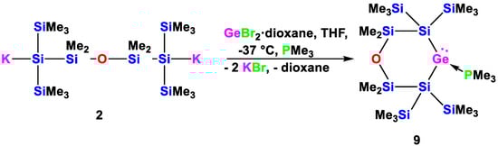 Reaction of 1,5-oligosilanylene diide 2 with GeCl2 in the presence of PMe3 to the cyclic silylated germylene PMe3 adduct 9.