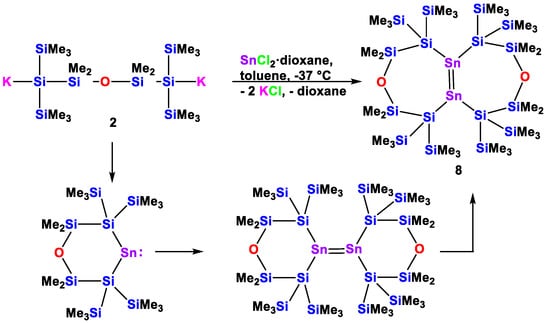 Reaction of 1,5-oligosilanylene diide 2 with SnCl2 in the absence of a donating Lewis base to the bicyclic tetrasilylated distannene 8.