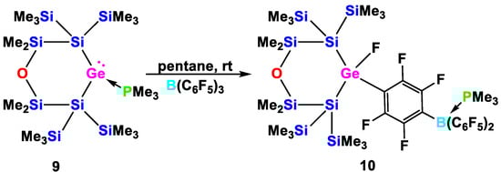 In previous studies, we found that the addition of strong donor molecules like phosphanes or N-heterocyclic carbenes (NHCs) is essential to achieve a clean germylene formation in the reaction of silanides with GeCl2. In order to get access to the free germylene from its phosphane adduct, treatment with a fairly strong Lewis acid proved to be a good strategy. The Lewis acid would abstract the donor and release the germylene. Massey’s borane B(C6F5)3 [40] was found to be a particularly good reagent in this respect. When compound 9 was treated with B(C6F5)3, we expected PMe3 abstraction, followed by the formation of the free germylene, which could dimerize in a similar way as shown above for the analogous stannnylene. Alternatively, we also observed several instances where the germylene undergoes a 1,2-silyl shift to the germanium atom, thus forming a silagermene, which might undergo a 2 + 2 cycloaddition reaction in a subsequent step. However, in the current case, our expectations were not met and another reaction pathway was observed. While the PMe3 abstraction seemingly occurred as expected, the free germylene reacted by insertion into a p-C-F bond of (C6F5)3B·PMe3 (Scheme 8). This is quite unexpected as we have never before observed activation of C-F bonds in related reactions. Nevertheless, the reaction is not completely without precedence. Roesky and co-workers observed C-F activation of heteroleptic chloro- and amino-silylenes (LSiX, X = Cl, NR2, L = PhC(NtBu)2) stabilized by a benzamidinato ligand with tert-butyl substituents on the nitrogen atoms [41,42]. Related reactivity was even observed with germylenes and stannylenes [43]. One particular aspect of this chemistry is that there is some completion between oxidative addition of C-F bonds and fluoride metathesis to products, where the divalent character of the tetrylene is retained and only the substituent is exchanged for fluoride. This chemistry has also been studied theoretically [44].