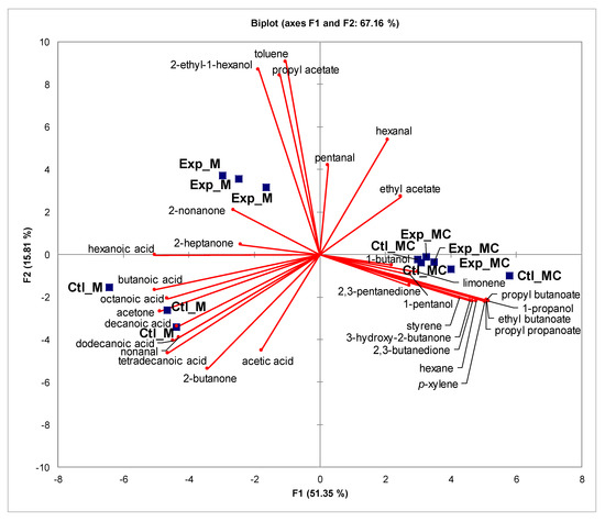 In Table 3, the VOCs identified in the milk and mozzarella cheese samples are given, and Table 4 lists their sensory descriptors and odor thresholds, based on the available literature [5,6,16,20,31,32,33,34,35,36,37,38,39,40,,41,4243]. The performed analysis allowed us to identify in 18 different VOCs in the headspace of milk samples recognized as odor-conferring molecules. Except for hexanoic acid, 2-heptanone, and 2-nonanone, the dietary treatment influenced all milk VOCs in terms of quality and quantity. In detail, the presence of pentanal, hexanal, 2-ethyl-1-hexanol, ethyl acetate, propyl acetate, and toluene characterized the Exp milk, whereas acetic acid and 2-butanone were found only in Ctl milk. The most abundant volatile compounds were the free fatty acids (FFA) that were almost all statistically higher in Ctl milk, namely tetradecanoic acid (p < 0.001), dodecanoic acid (p < 0.01), decanoic acid, butanoic acid (p < 0.05), and octanoic acid (p < 0.1). In similarity, acetone and 2-butanone, among ketones, and nonanal, among aldehydes, were higher in Ctl milk. Overall, in terms of chemical families, acids and ketones were higher in Ctl milk, whereas the inclusion of fresh forage led to the formation of alcohols, esters, hydrocarbons, and aldehydes, compounds that, except nonanal, were found only in Exp milk. Twenty-three different VOCs were detected in mozzarella cheese. For both Ctl and Exp mozzarella cheeses, hydrocarbons and esters were the most represented VOCs followed by ketones, aldehydes, alcohols, and finally, the FFA (Table 3). From a qualitative point of view, butanoic acid and 2,3 pentanedione were detected only in Ctl mozzarella, whereas 1-butanol and 1-pentanol were only in the Exp mozzarella. The transformation of milk into mozzarella led to a reduction of the differences between the two kinds of cheeses, and only propyl butanoate was found to be statistically higher (p < 0.01) in the Ctl mozzarella. These results indicate that the Exp cheese could be characterized by less intense ‘fruity’, ‘cream’, and ‘cheese’ notes than the Ctl sample (Table 4). The general picture of these findings is shown in the biplot of the principal component analysis (PCA) made on VOCs from milk and mozzarella cheese (Figure 1). The two main principal components explain 67.16% of the variance, with the Principal Component 1 discriminating milk and cheese samples. It is possible to note that the mozzarella cheese was less affected by the dietary treatment than milk. The milk samples were characterized mainly by the volatile fatty acids, acetone, 2-butanone, 2-heptanone, 2-nonanone, and nonanal. On the contrary, mozzarella cheese samples were characterized by esters (except propyl acetate), hydrocarbons (except toluene), alcohols (except 2-ethyl-1-hexanol), 2,3-butanedione, 2,3-pentanedione, and 3-hydroxy-2-butanone. The Principal Component 2 discriminated the Exp milk samples from the Ctl ones. The use of fresh forage led to have milk with a higher level of 2-nonanone, 2-ethyl-1-hexanol, toluene, pentanal, hexanal, and propyl acetate. In contrast, the Ctl samples were characterized by volatile fatty acids, acetone, 2-butanone, and nonanal.