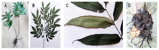 Photographs of different plant parts of A. helferiana: (A) Whole plant at early stage; (B) leaf (frond) of matured plant; (C) leaf bearing sori at the margin; and (D) rhizome.
