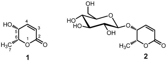 Compound 1 was obtained as a colorless liquid, [α]D22 −109.4 (c 1.28, H2O). The UV spectrum of compound 1 showed absorption maxima (λmax) at 210 nm. The 1H-NMR spectrum of compound 1 in in DMSO-d6 (Table 1) showed proton signals for two olefinic protons at δH 7.01 p (1H, dd, J = 9.6, 5.7 Hz) and 5.98 ppm (1H, d, J = 9.6 Hz), two methine protons at δH 4.48 (1H, qd, J = 6.6, 2.8 Hz) and δ 3.93 ppm (1H, m), and a methyl group at δH 1.29 (3H, d, J = 6.6 Hz), which were similar to that of 5,6-dihydro-5-hydroxy-6-methyl-2H-pyran-2-one [26]. The small coupling constant of 2.8 Hz between the protons attached to C-5 and C-6 suggested the cis-orientation of these proton as the coupling constant for these protons in trans-orientation is reported to be about 6 Hz [26,28,29] Comparing the obtained data with the published articles, the structure of compound 1 was elucidated as (−)-epi-osmundalactone [(5R,6R)-5,6-dihydro-5-hydroxy-6-methyl-2H-pyran-2-one] as shown in Figure 2 [26]. The 13C NMR spectrum of compound 1 displayed total of six carbon signals that were also superimposable with the reported values [26,28]. The epi-osmundalactone moiety was reported from nature in the form of its glucoside, angiopteroside from Angiopteris lygodiifolia Ros. [30] and also as a dual-lactone compound, angiopterolactone A from Angiopteris caudatiformis Hieron [31]. Recently, its isolation in pure form from natural source (Angiopteris esculenta Ching) was reported by Chen et al. in 2010 [26]. Similarly, the stereoselective synthesis of 1 has also been reported by Blume et al. [28]. On the other hand, (−)-osmundalactone having 5R,6S-configuration was previously isolated and identified from the fern Osmunda japonica Thunb [29] and (+)-osmundalactone having 5S,6R-configuration was reported from a fungus, Paxillus atromentosus [32].