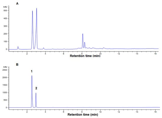 Ultra performance liquid chromatography (UPLC) chromatograms of methanol extract of A. helferiana and standard-mixture (compounds 1 and 2). A suitable UPLC condition was established and the UPLC chromatogram of methanol extract (5 mg/mL) of A. helferiana (A) was obtained. The standard compound 1 and 2 were mixed (1 mg/mL each) and the UPLC chromatogram was obtained under similar condition (B) maintaining same column condition and solvent system. The peaks in chromatogram of methanol extract were identified as compounds 1 and 2 peaks after comparing with the retention time and UV-spectrum with that of standard compound peaks in chromatogram B.