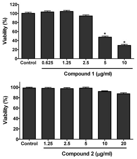 The cell viability assay was performed for the isolated compounds against 3T3-L1 cells using the MTT assay. Concentrations ranging from 0.625 to 40 µg/mL were used for the viability study. Compound 1 was found toxic above 2.50 µg/mL whereas compound 2 was toxic above 20 µg/mL (Figure 4).