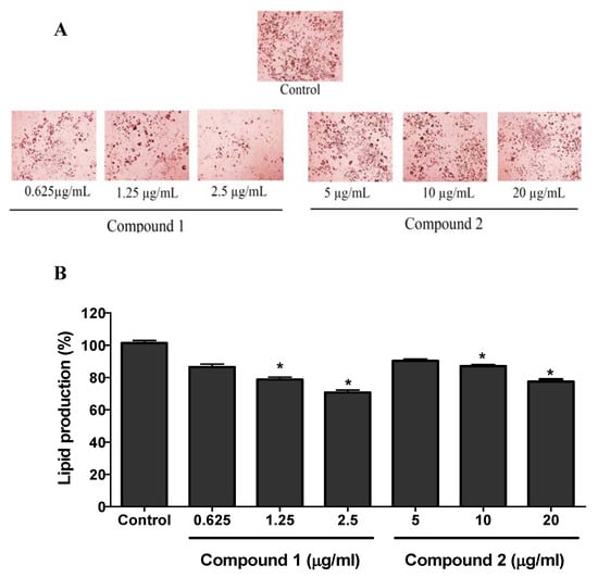 The non-toxic concentrations of compound 1 (0.625, 1.25, and 2.5 µg/mL) and compound 2 (5, 10, and 20 µg/mL) to the 3T3-L1 cells were used for the anti-adipogenic activity study. 3T3-L1 cells were cultured in 6-well plates and differentiated using differentiation media with or without the presence of compounds 1 and 2. The lipid produced in the cells was stained with ORO (oil-red-O) solution as depicted in the Figure 5A by the red pigments. Both compound 1 and 2 showed the significant inhibition of lipid production in 3T3-L1 cells. The results in Figure 5B showed the quantitative data for the lipid production in the sample (compounds 1 and 2) treated and control groups. Compared to the control, compound 1 showed maximum lipid inhibition of around 30% (at 2.5 µg/mL) while compound 2 showed around 20% lipid inhibition at 20 µg/mL.