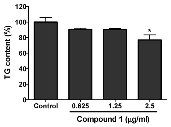 Compound 1 having greater anti-adipogenic activity from the above experiment was further studied for its effect on triacylglycerol (TG) level in 3T3-L1 cells. The effect on TG content in the differentiated 3T3-L1 cells with or without the presence of isolated compound was analyzed. Compound 1 showed the significant inhibition of TG in the differentiated 3T3-L1 cells. A maximum of 20% inhibition of TG compared to the control was shown at a concentration of 2.5 µg/mL by compound 1 (Figure 6).