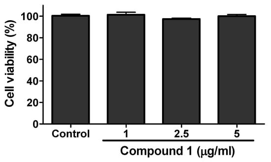 RAW cells viability assay of compound 1. Raw cells were cultured and seeded in 96-well plate. After more than 80% confluence, the cells were treated with different concentration of compound 1 and cell viability was determined using MTT-assay. The data show relative mean expression ± SD of triplicate experiments.