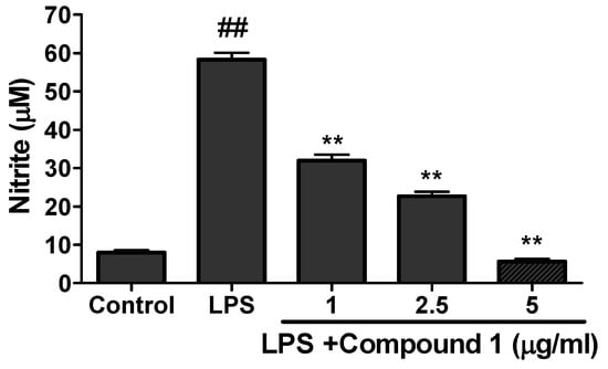 Production of nitrite ions after the treatment of compound 1. RAW cells were cultured and seeded in 96-well plate. After that the cells were exposed to LPS and followed by treatment of different concentration of compound 1. The production of nitrite ion in presence or absence of samples was evaluated using Griess reagent. The data show relative mean expression ± SD of triplicate experiments. Statistical significance was calculated using one-way ANOVA followed by Dunnett’s multiple comparisons test. ## P < 0.01 vs. Control; ** P < 0.01 vs. LPS.