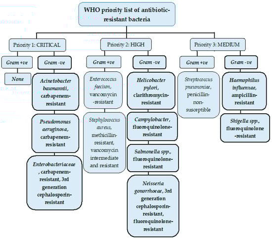 Resistance to antimicrobials is a growing crisis in clinical medicine. In 2017, the WHO published a list of bacteria where new antibiotics to tackle them are needed urgently and grouped them according to their priority as critical, high, and medium (Figure 1).