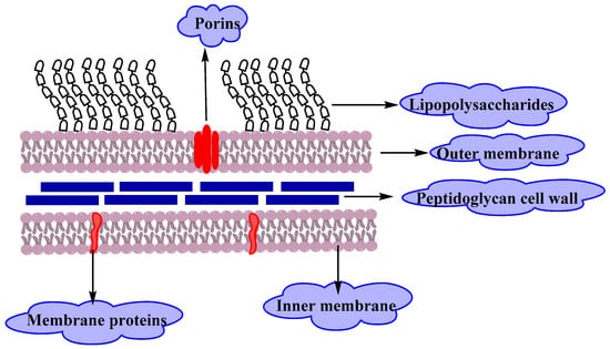 Gram-negative bacteria have an envelope that consists of three layers (Figure 2).The first layer is the outer membrane (OM), a protective and a unique feature that distinguishes Gram-negative bacteria from Gram-positive bacteria. The OM has phospholipids that are bound to the inner leaflet of the membrane, and lipopolysaccharide (LPS) bound to the outer leaflet which is known to cause endotoxic shock. Moreover, the OM contains proteins called the outer membrane proteins (OMPs) such as porins and others which allow the passage of small molecules like amino acids and small saccharides. The second layer is the peptidoglycan cell wall which is a rigid exoskeleton that determines the cell shape and consists of a repeat unit of the disaccharide N-acetyl glucosamine-N-acetylmuramic acid [3]. The third layer is the inner membrane (IM) which is a phospholipid bilayer that is responsible for multifunctional processes like structure, transport, and biosynthetic functions. In addition, it is the site for DNA anchoring and plays an important role in sister chromosomes separation [4].