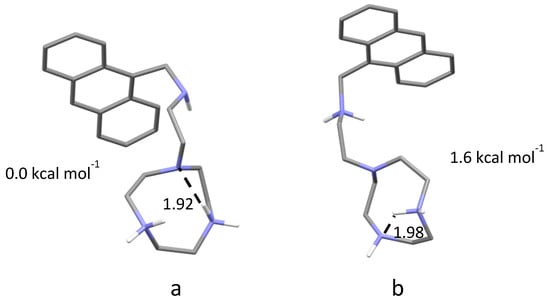 As can be seen from this table, L behaves as tetraprotic base, in agreement with the presence of four amine groups in its structure. The equilibrium constants for the binding of successive protons decreases with increasing ligand protonation, according to the general behaviour of similar polyamines [54]. Based on previous data [54], the highest (logK = 10.26) and the lowest (logK = 1.74) constants can be assigned, respectively, to secondary and tertiary amine groups of the macrocyclic ring, while the assignment of the intermediate protonation constants required additional information. In this respect, the variation of the fluorescence emission properties of L with pH is greatly instructive. As shown in Figure 2, the emission spectra of L are characterized by the typical bands of anthracene. The molecule is strongly emissive in acidic solution, but its emission rapidly decreases above pH 3.5 to be completely quenched above pH 9.5. According to previous studies, quenching of the emission from similar molecules is expected to occur by photoinduced electron transfer (PET) to the excited anthracene fluorophore from the lone pair of a close amine group, such as the secondary amine groups of the ligand tail [51]. Protonation of this amine group prevents the PET process, activating the emission. The inset of Figure 2, where the emission at 416 nm (excitation at 362 nm) is superimposed to the distribution diagram of the species formed by L as a function of pH, clearly shows that the fluorescence emission of L starts being activated upon protonation of HL+ to form H2L2+ to reach its maximum with the formation of H3L3+, that is, the amine group of the ligand tail starts being involved in protonation, albeit partly, from the second protonation stage, becoming completely involved with the third one. Therefore, the partial emissive character of H2L2+ could be due to some sharing of H+ ions between the amine nitrogen of the ligand tail and the secondary nitrogen atoms of the macrocycle. To shed some light on this, we performed modelling calculations on the solvated H2L2+ species (see experimental section). Two conformers of similar energy were found. In the lowest energy one, both acidic hydrogen atoms are localized on the secondary nitrogen atoms of the macrocycle (Figure 3a), while in the other conformer the acidic hydrogen atoms are on a secondary amine group of the macrocycle and on the nitrogen atom of the ligand tail (Figure 3b). The calculated energy difference between these pair of conformers is small (1.6 kcal/mol) so that both conformers should be populated at room temperature, albeit with different abundance, in agreement with the fluorescence emission results.