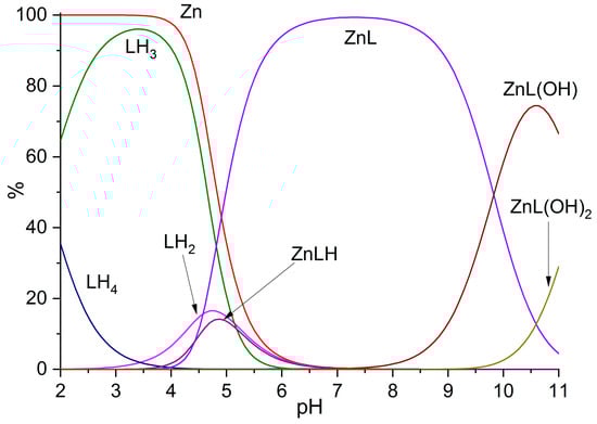 Distribution diagram of the species formed in the system Zn2+/L as a function of pH. [Zn2+] = [L] = 1 × 10−3 M. Charges omitted for simplicity.