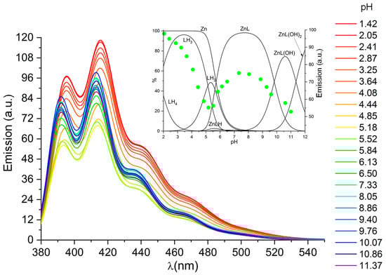 Emission spectra of Zn2+/L at different pH values (λexc 362 nm). Inset: distribution diagrams of the species formed as a function of pH and emission intensities (dots) at 416 nm. [L] = [Zn2+] = 1 × 10−5 M.