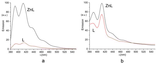 Emission spectra of L and Zn2+/L complexes, at pH 9, for: (a) [Zn2+] = [L] = 1 × 10−6 M, (b) [Zn2+] = [L] = 1 × 10−9 M. λexc 362 nm.
