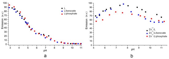 pH dependence of the emission intensity at 416 nm (λexc 362 nm) of the systems: (a) L, L/benzoate, L/phosphate; (b) Zn2+/L, Zn2+/L/benzoate, Zn2+/L/phosphate. [L] = [Zn2+] = 1 × 10−5 M, [benzoate] = [phosphate] = 3 × 10−5 M.