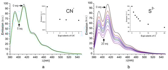 (a) Variation of the emission spectra of Zn2+/L at pH 9 upon addition of cyanide (a) and sulphide (b). [L] = [Zn2+] = 1 × 10−5 M. λexc 362 nm. Insets: Emission intensity at 416 nm versus the added equivalents of cyanide (a) and sulphide (b).