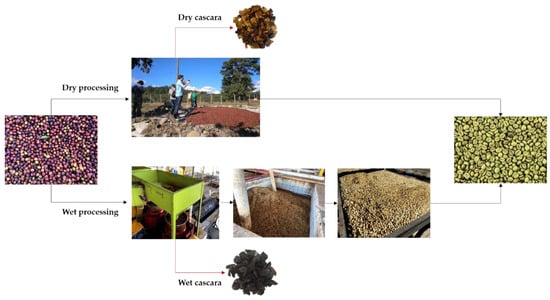 The composition of this by-product depends on the type of processing employed (Figure 1) [4]. CC from dry processing is composed by skin, pulp, mucilage, parchment and part of silverskin, while CC generated during the wet coffee processing consists of the skin and pulp of the coffee cherries.