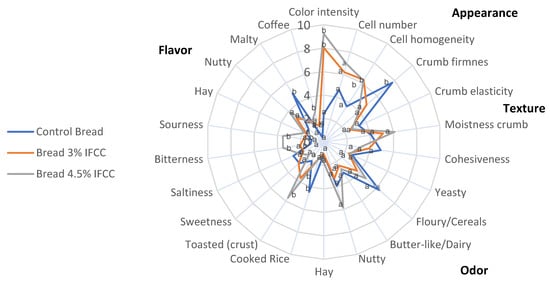 Results of the lineal scale (0–10) test of gluten-free breads by 8 trained panelists. Different letters indicate significant differences among samples (Tukey Test, p < 0.05).