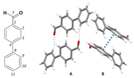 Figure 1 presents a fragment of the crystal structure of 4-phenylbenzaldehyde, along with the numbering scheme adopted in this work. The crystal structure (monoclinic, space group P21/a, Z = 4) [21] is built from two types of dimers: the C-H···O bonded dimers (molecules labeled A) coexist with pi-stacking dimers (molecules labeled B), as shown in Figure 1. All molecules are involved in both types of dimers, but they have slightly different secondary neighboring contacts.
